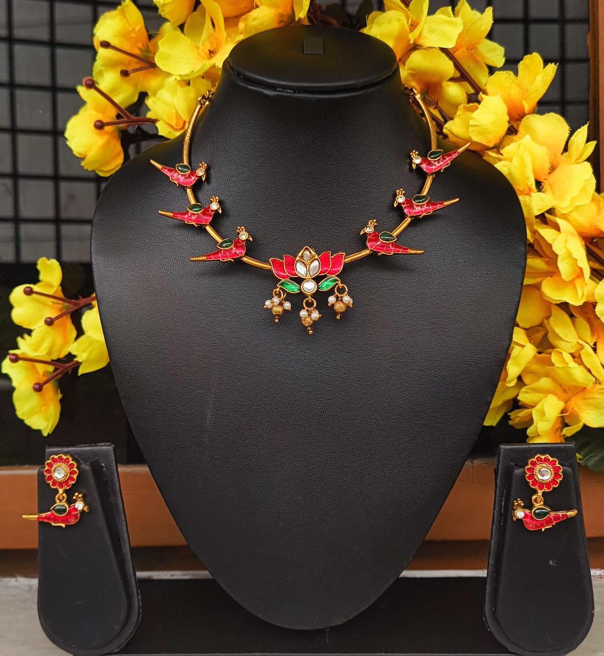 The Lotus Bird Necklace showcases a charming blend of lotus flower and bird motifs, creating a design that feels both graceful and unique. The detailed craftsmanship highlights the beauty of traditional jewellery patterns.